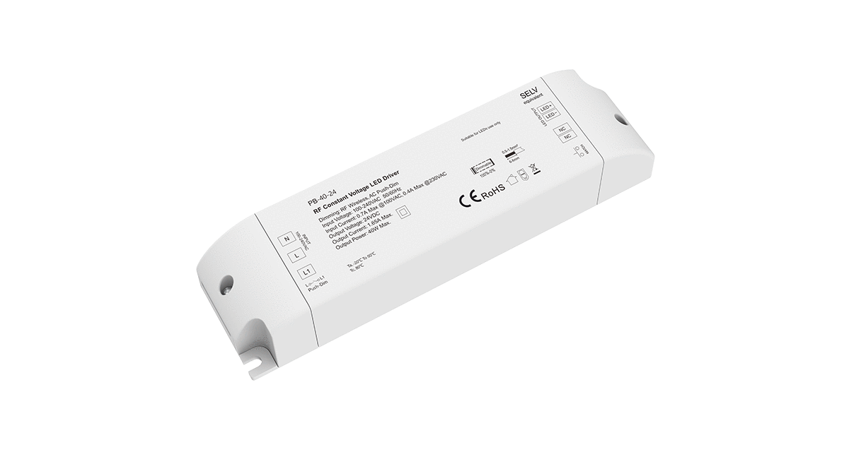 Vieno kanalo 1.67A nuolatinės įtampos 24V DC LED maitinimo šaltinis su RF imtuvu, skirtas vienos spalvos LED juostai. Pultelio veikimo dažnis yra 2,4GHz, tokio dažnio signalai gali sklisti toliau ir yra mažiau trikdomi kliūčių, tokių kaip sienos, pertvaros ir t.t. Valdiklis taip pat turi Push-Dim funkciją, tai reiškia, jog valdiklį galima valdyti ne tik su pulteliu, bet ir su įprastu skambučio tipo (Push-Dim) jungtuku.