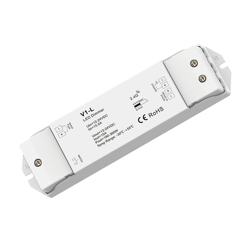 Vieno kanalo 15A nuolatinės įtampos (5-36V DC) LED valdiklis, skirtas vienos spalvos LED juostai. Pultelio veikimo dažnis yra 2,4GHz, tokio dažnio signalai gali sklisti toliau ir yra mažiau trikdomi kliūčių, tokių kaip sienos, pertvaros ir t.t. Valdiklis taip pat turi Push-Dim funkciją, tai reiškia, jog valdiklį galima valdyti ne tik su pulteliu, bet ir su įprastu skambučio tipo (Push-Dim) jungtuku.
