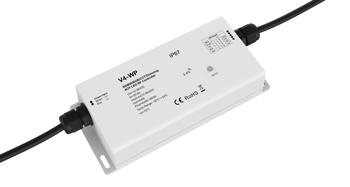 Nuolatinės įtampos LED valdiklis, skirtas spalvotai RGB LED juostai (taip pat gali būti naudojamas ir su 2 keičiamo atspalvio (CCT) juostų atkarpomis iki 5A bei valdyti 4 vienos spalvos juostų atkarpoms iki 5A). Skirtas lauko sąlygoms - itin aukšta atsparumo aplinkos poveikiui klasė IP67.