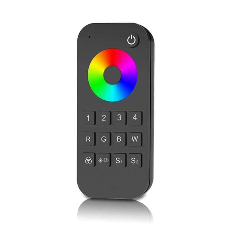 4 zonų RGB/RGBW Valdymo pultelis RT9 – spalvotų RGB ar RGBW LED juostų valdymo pultas su sensoriniu ratuku, skirtas valdyti keturioms zonoms. Pultelio veikimo dažnis yra 2,4GHz, tokio dažnio signalai gali sklisti toliau ir yra mažiau trikdomi kliūčių, tokių kaip sienos pertvaros ir t.t.