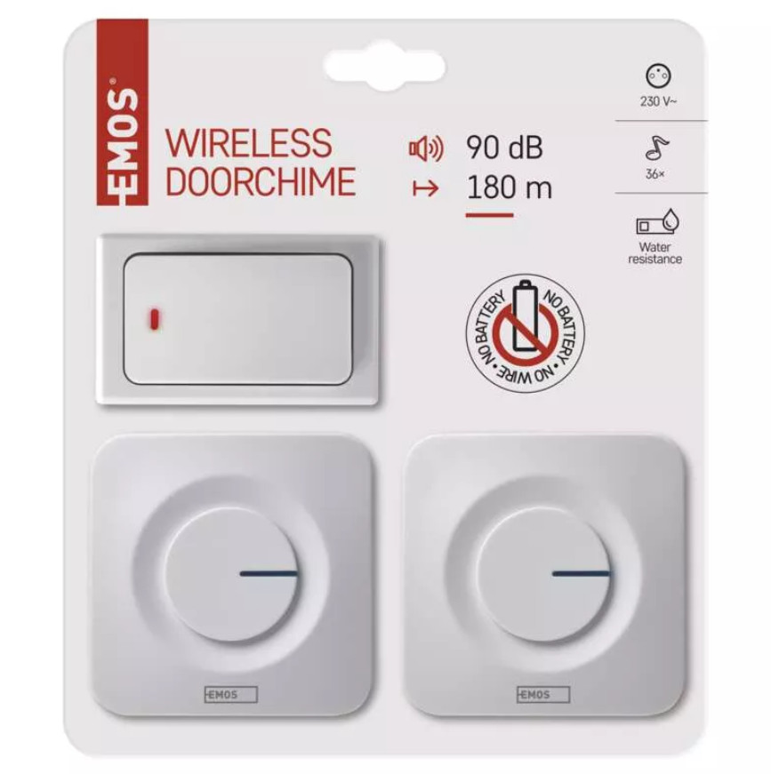 Šio skambučio imtuvai maitinami iš įprasto 230V tinklo lizdo, o siųstuvui (mygtukui) maitinti nereikalingas joks maitinimo šaltinis - signalo persiuntimui reikalinga energija pagaminama po klavišu esančios spyruoklės pagalba. Gamintojas - EMOS (Čekija).