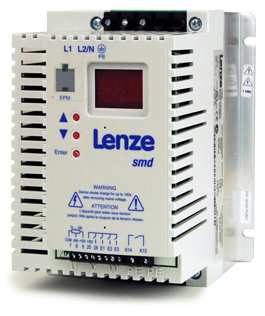 Lenze AC Tech SMD serijos dažnio keitiklis trifazio iki 1.5kW variklio valdymui. Keičia trifazę maitinimo įtampą į variklio maitinimui skirtą trizafę keičiamo dažnio įtampą.