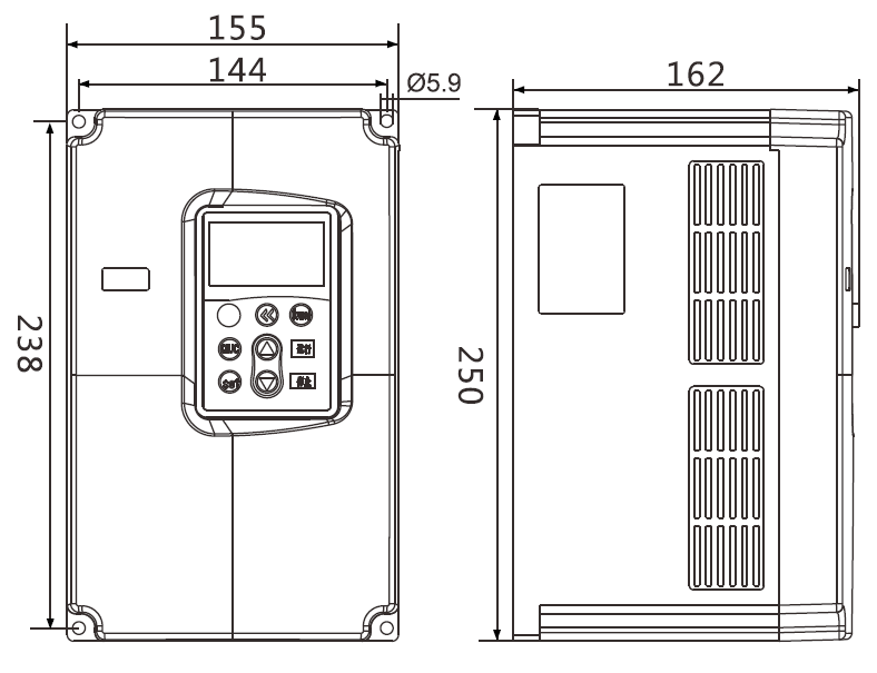 Su integruota nuimama nuo korpuso klaviatūra valdymui, LED ekranu; standartinėje komplektacijoje - Modbus RTU jungtis. Valdymo klaviatūroje integruotas potenciometras.