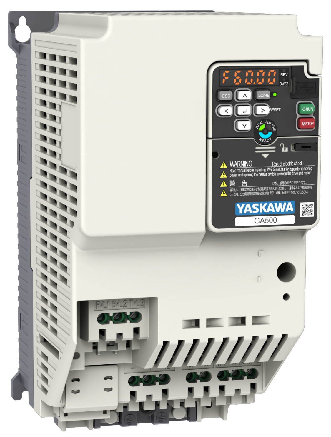 Yaskawa (Japonija) gamintojo GA500 serijos dažnio keitiklis trifazio iki 22.0kW variklio valdymui. Keičia trifazę maitinimo įtampą į variklio maitinimui skirtą trizafę keičiamo dažnio įtampą.