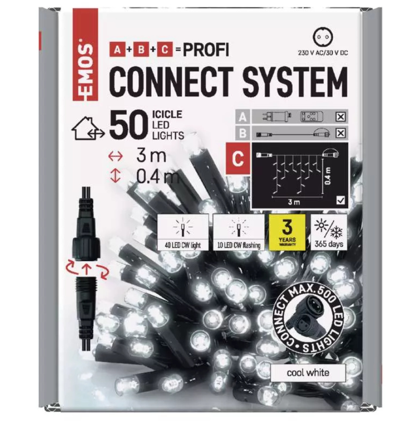• EMOS PROFI CONNECT girlianda - varvekliai 50LED 3m IP44 šaltai balta + mirksinti šaltai balta D2CC01