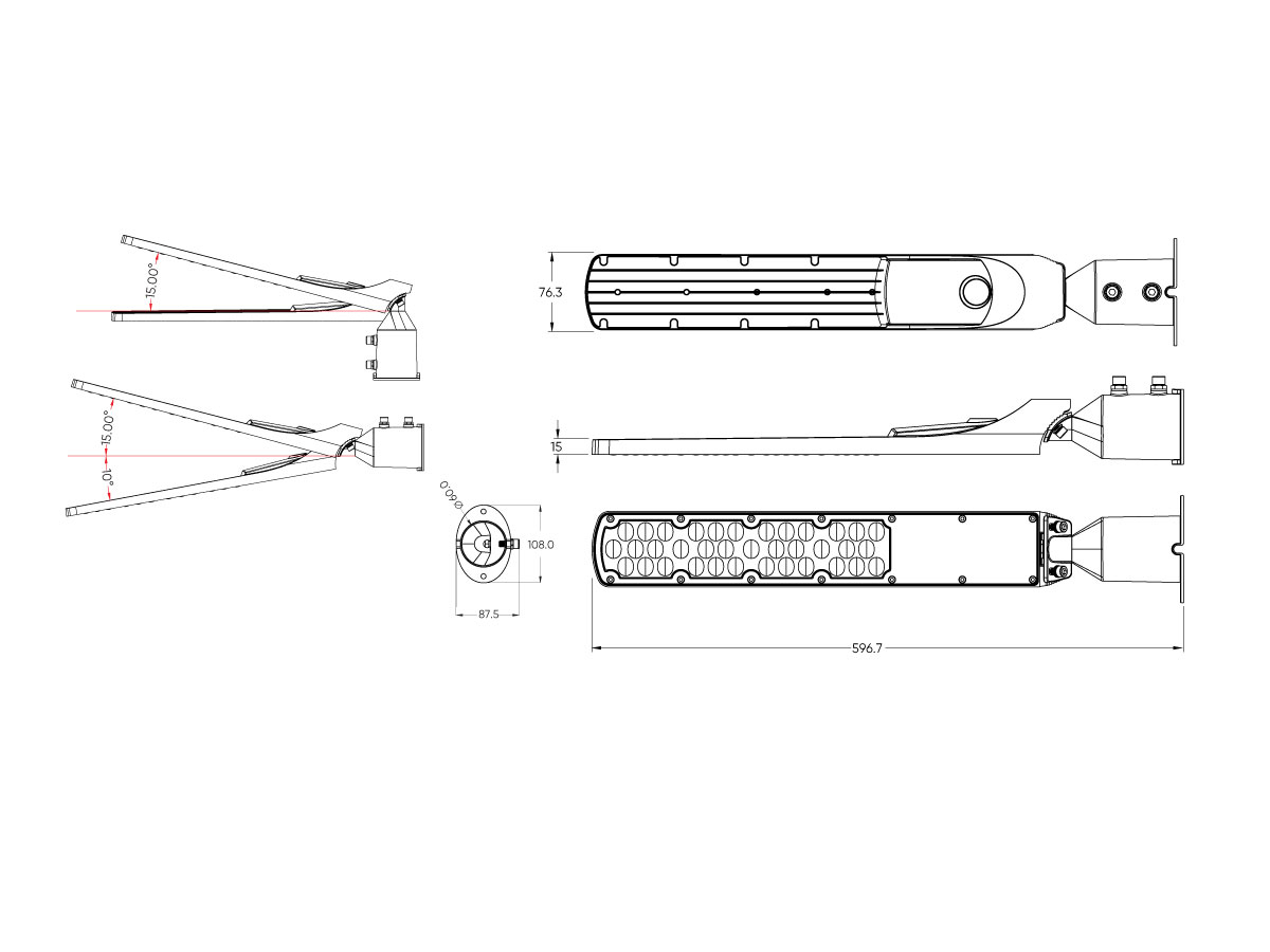 Apsaugos nuo aplinkos poveikio klasė - IP65. Korpusas - pilkai dažytas aliuminio liejinys. Montuojamas ant 60 mm gembės (šviestuvas iš karto komplektuojamas su reguliuojamo kampo montavimo adapteriu); yra galimybė montuoti tiesiogiai ant sienos - montažinės skylės reguliuojamo kampo adapteryje.