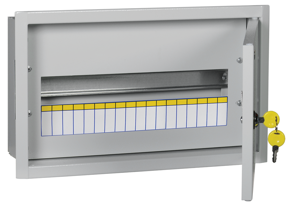 IEK metaliniai paskirstymo skydeliai komplektuojami su spynele bei 2 raktais. Skydai komplektuojami be N+PE šynų.