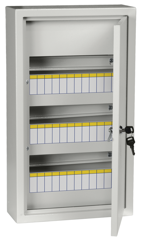 IEK metaliniai paskirstymo skydeliai komplektuojami su spynele bei 2 raktais. Skydai komplektuojami be N+PE šynų.