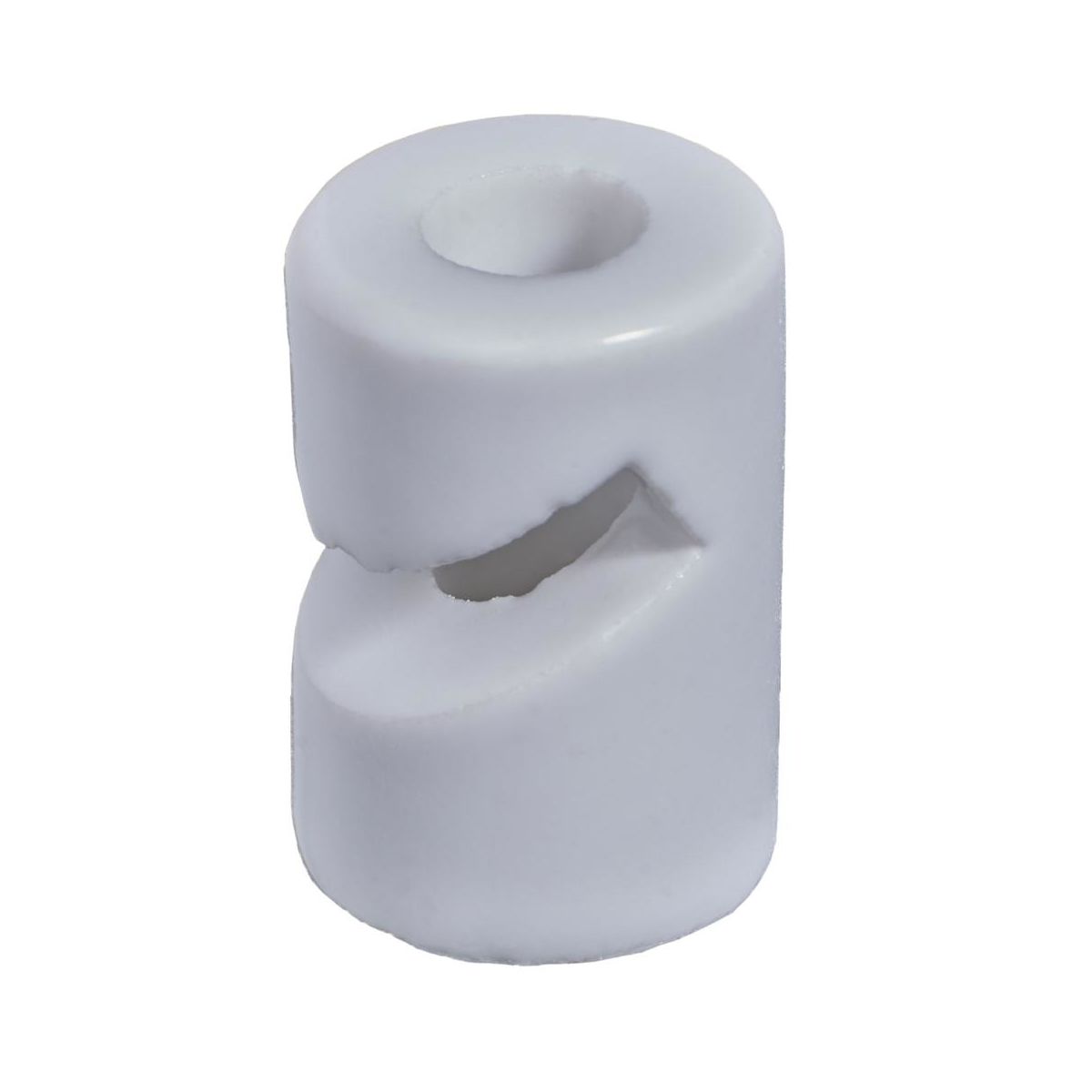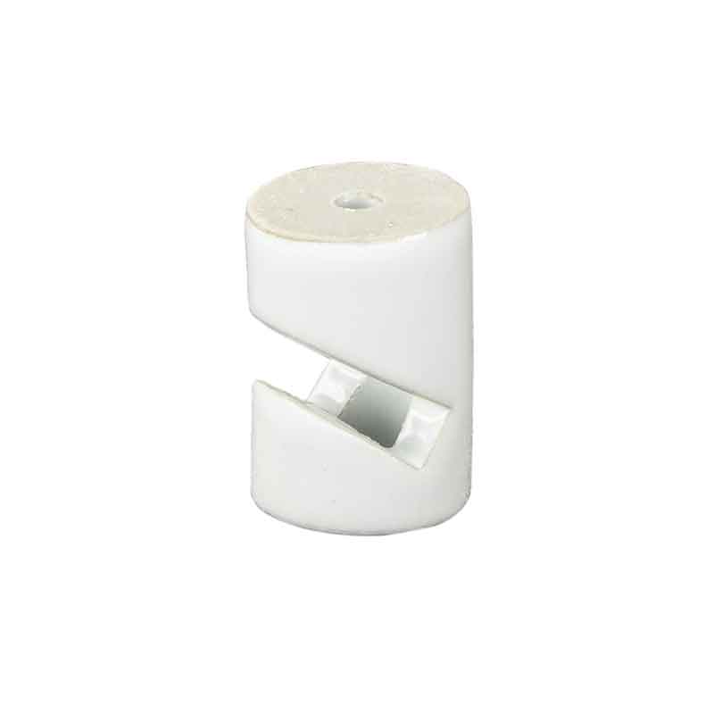 Blizgia balta glazūra dengtas keraminis laikiklis, idealiai tinkamas medžiaginiam šviestuvo kabeliui lygia išorine izoliacija.