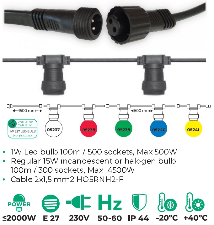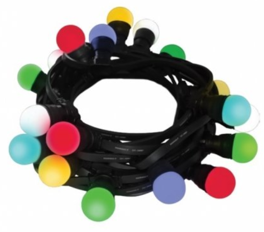 Girliandos kabelis - gumuotas. Lemputės išdėstytos kas 0.5m, bendras girliandos ilgis - 11.5 metro; iš jų - 1.5 m ilgio maitinimo kabelis. Girliandos jungiamos tarpusavyje.