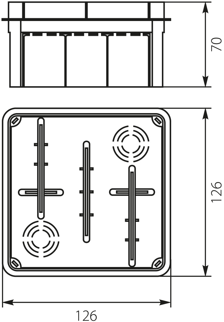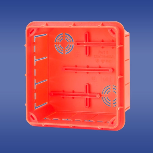 126x126x70 mm dydžio paskirstymo dėžutė, skirta montuoti į angas mūrinėse konstrukcijose.