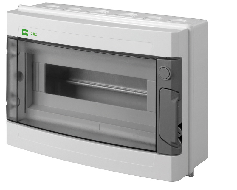Hermetiškas paviršinis paskirstymo skydelis. Korpusas pagamintas iš ABS plastiko. EP-LUX skydai standartiškai komplektuojami su N+PE kaladėlėmis (žiūrėti pridėtą dokumentaciją), taip pat gali būti rakinami spynele (teirautis atskirai).