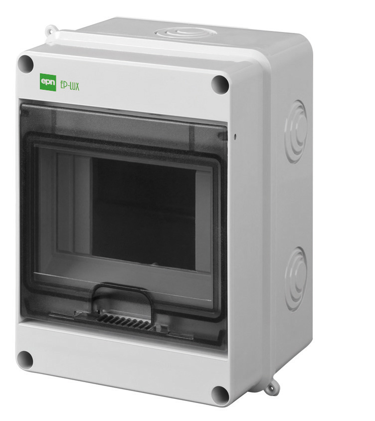 Hermetiškas paviršinis paskirstymo skydelis. Korpusas pagamintas iš ABS plastiko. EP-LUX skydai standartiškai komplektuojami su N+PE kaladėlėmis (žiūrėti pridėtą dokumentaciją), taip pat gali būti rakinami spynele (teirautis atskirai).