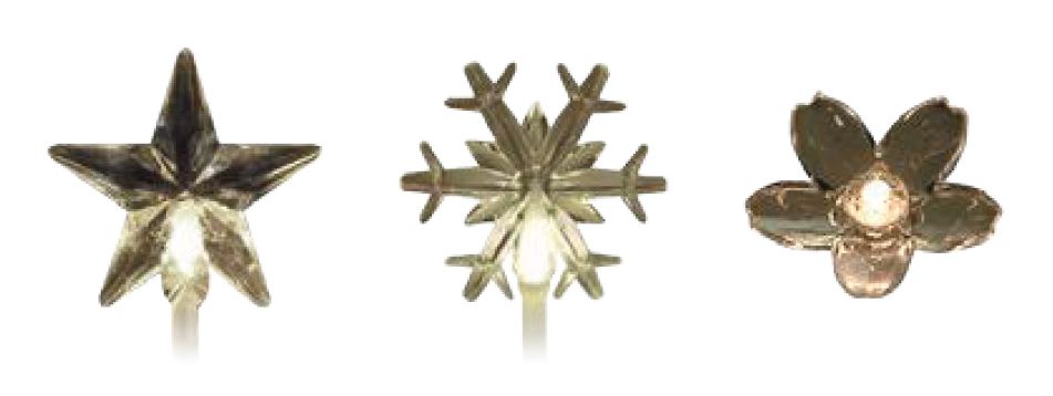 Lemputės - 5 mm dydžio; dekoratyvi žvaigždutės formos apdaila kiekvienai lemputei.