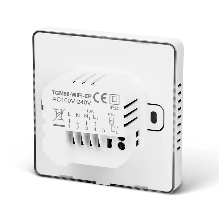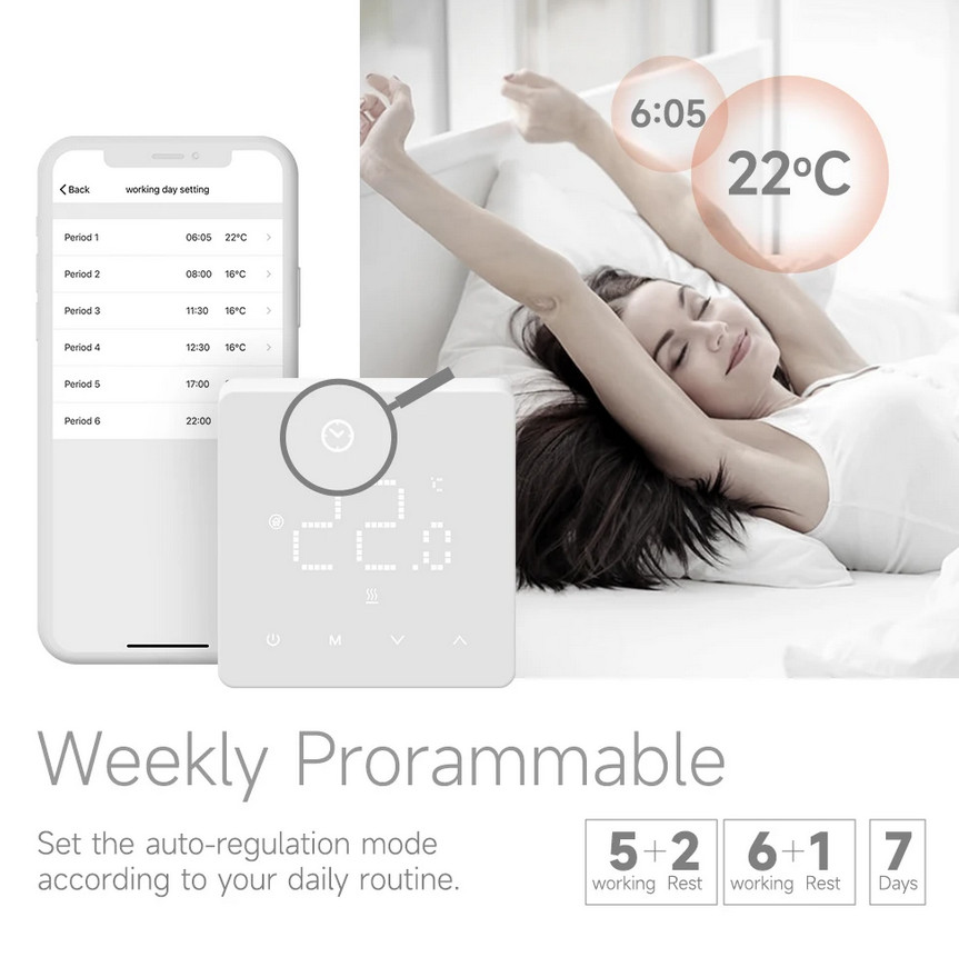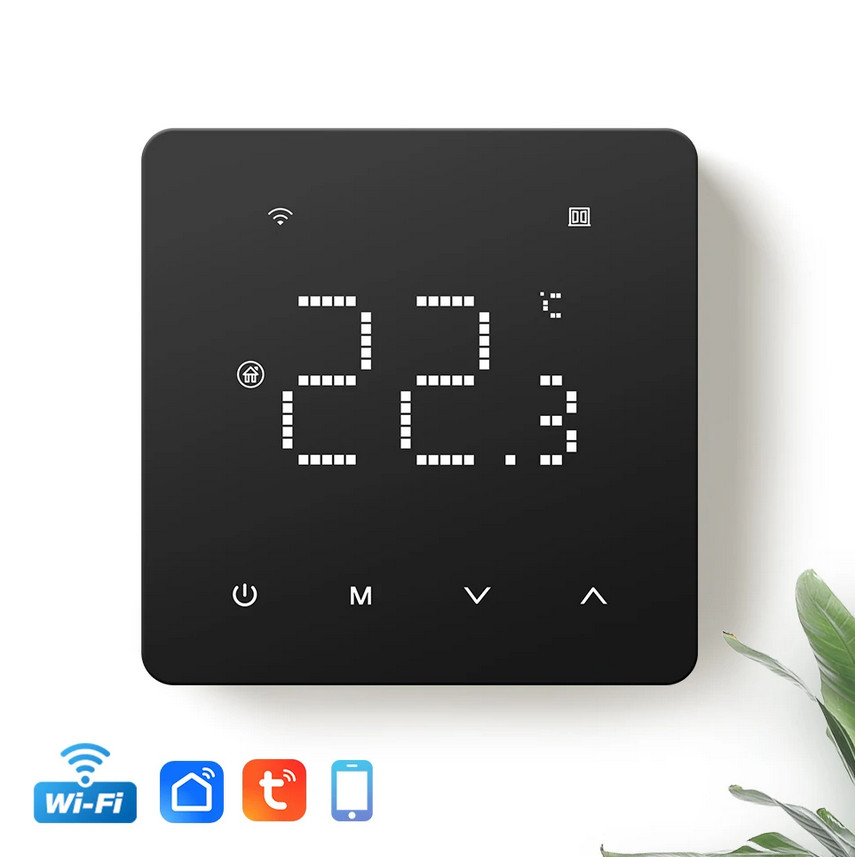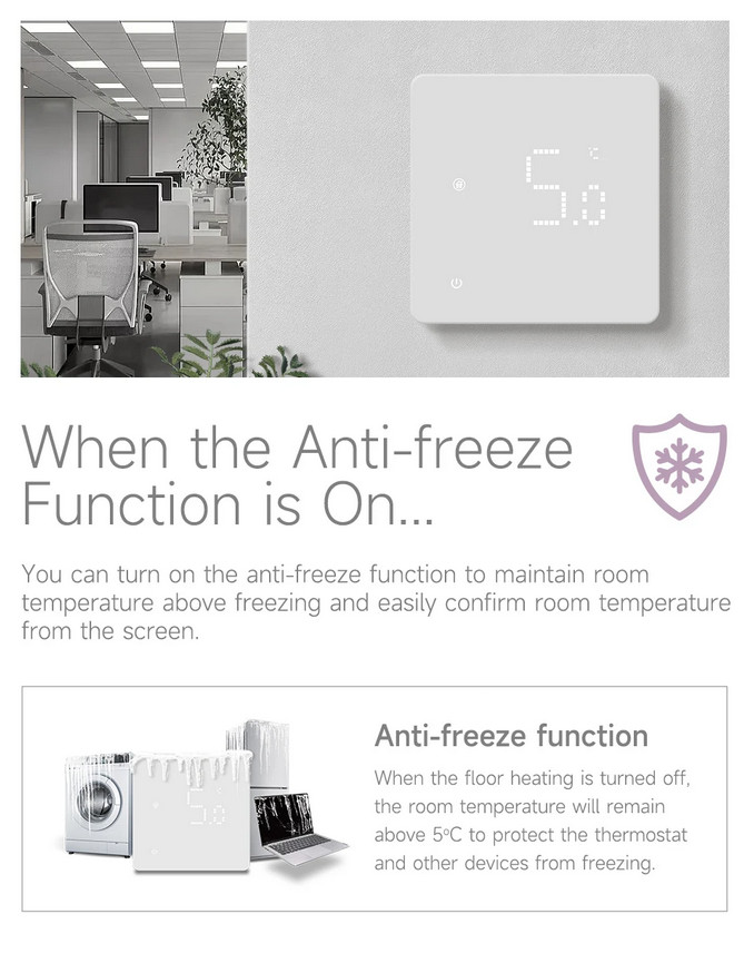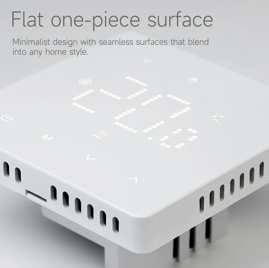 Grindiniam šildymui valdyti skirtas programuojamas (galimi 6 skirtingi temperatūros intervalai kiekvienai savaitės dienai) elektroninis termostatas. Komplekte yra grindinis temperatūros jutiklis su 3 m ilgio signalo perdavimo kabeliu. Termostatas taip pat turi integruotą oro temperatūros jutiklį - galima naudoti ir kaip patalpos šildymo termostatą. Priekinė dalis - juodos matinės spalvos plastiko, pilnai jutiklinis ekranas. Yra funkcija patalpų apsaugai nuo užšalimo, greito temperatūros sumažinimo iki +16°C, ekrano užrakto, šildymo išjungimo aptikus atidarytą langą funkcijos.