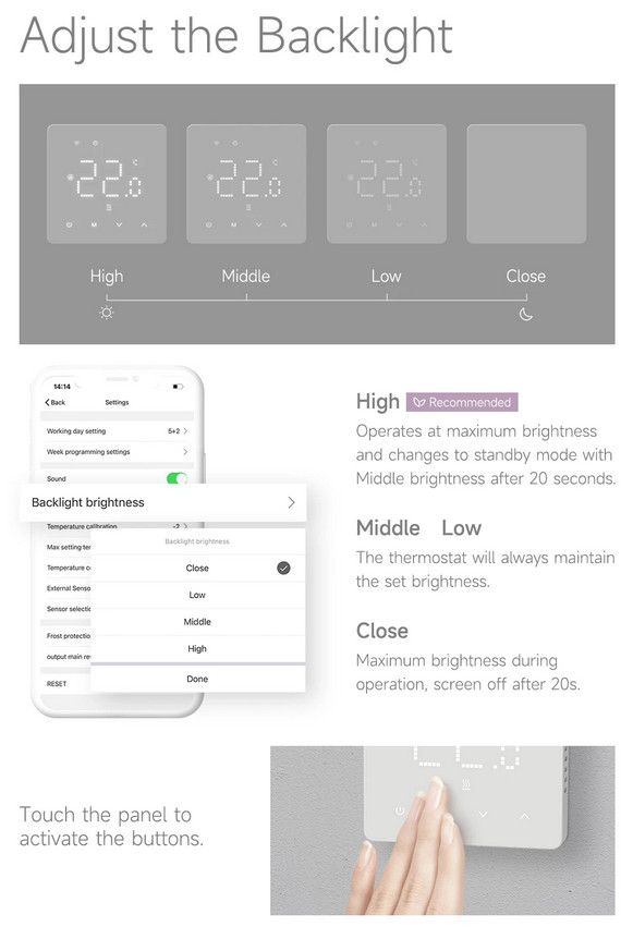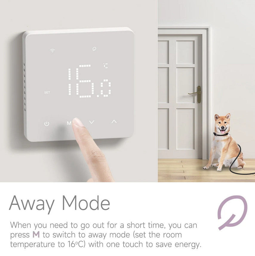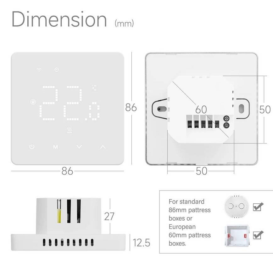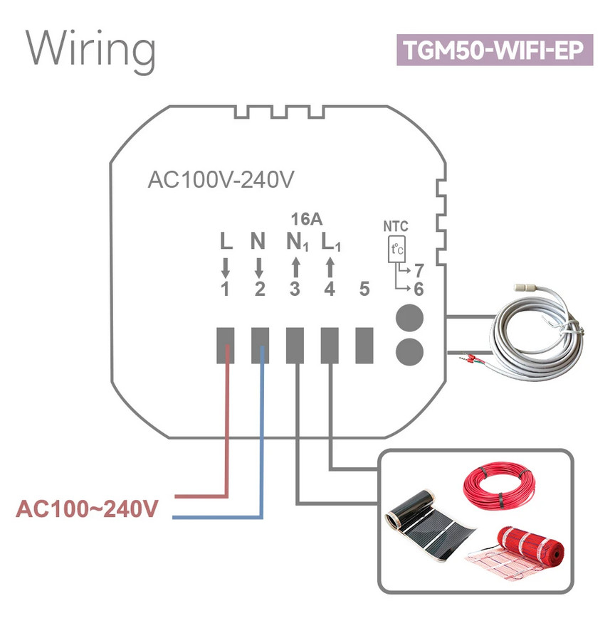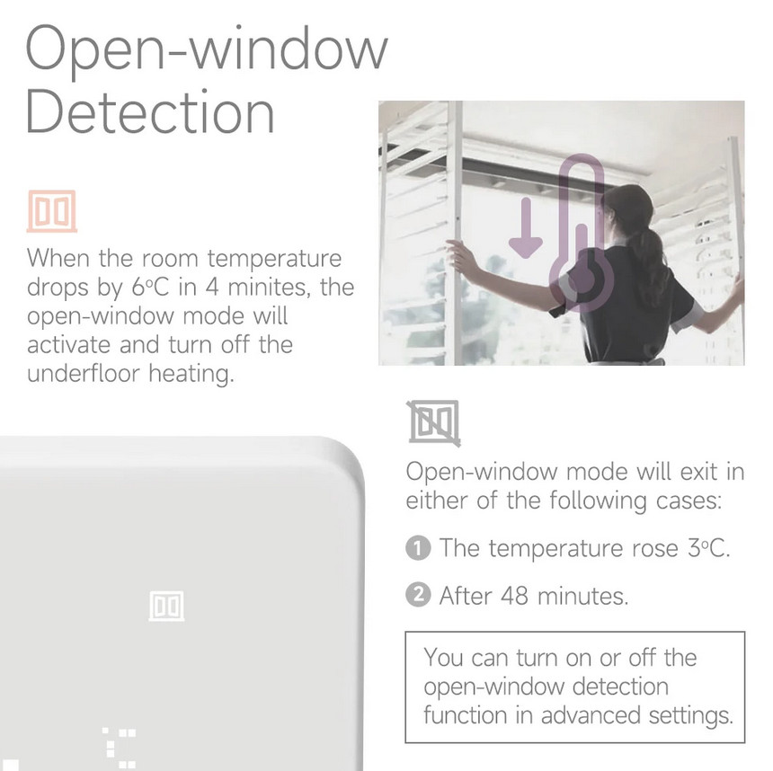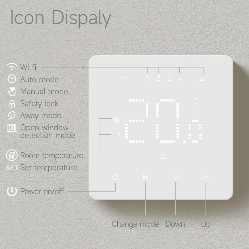 Grindiniam šildymui valdyti skirtas programuojamas (galimi 6 skirtingi temperatūros intervalai kiekvienai savaitės dienai) elektroninis termostatas. Komplekte yra grindinis temperatūros jutiklis su 3 m ilgio signalo perdavimo kabeliu. Termostatas taip pat turi integruotą oro temperatūros jutiklį - galima naudoti ir kaip patalpos šildymo termostatą. Priekinė dalis - juodos matinės spalvos plastiko, pilnai jutiklinis ekranas. Yra funkcija patalpų apsaugai nuo užšalimo, greito temperatūros sumažinimo iki +16°C, ekrano užrakto, šildymo išjungimo aptikus atidarytą langą funkcijos.