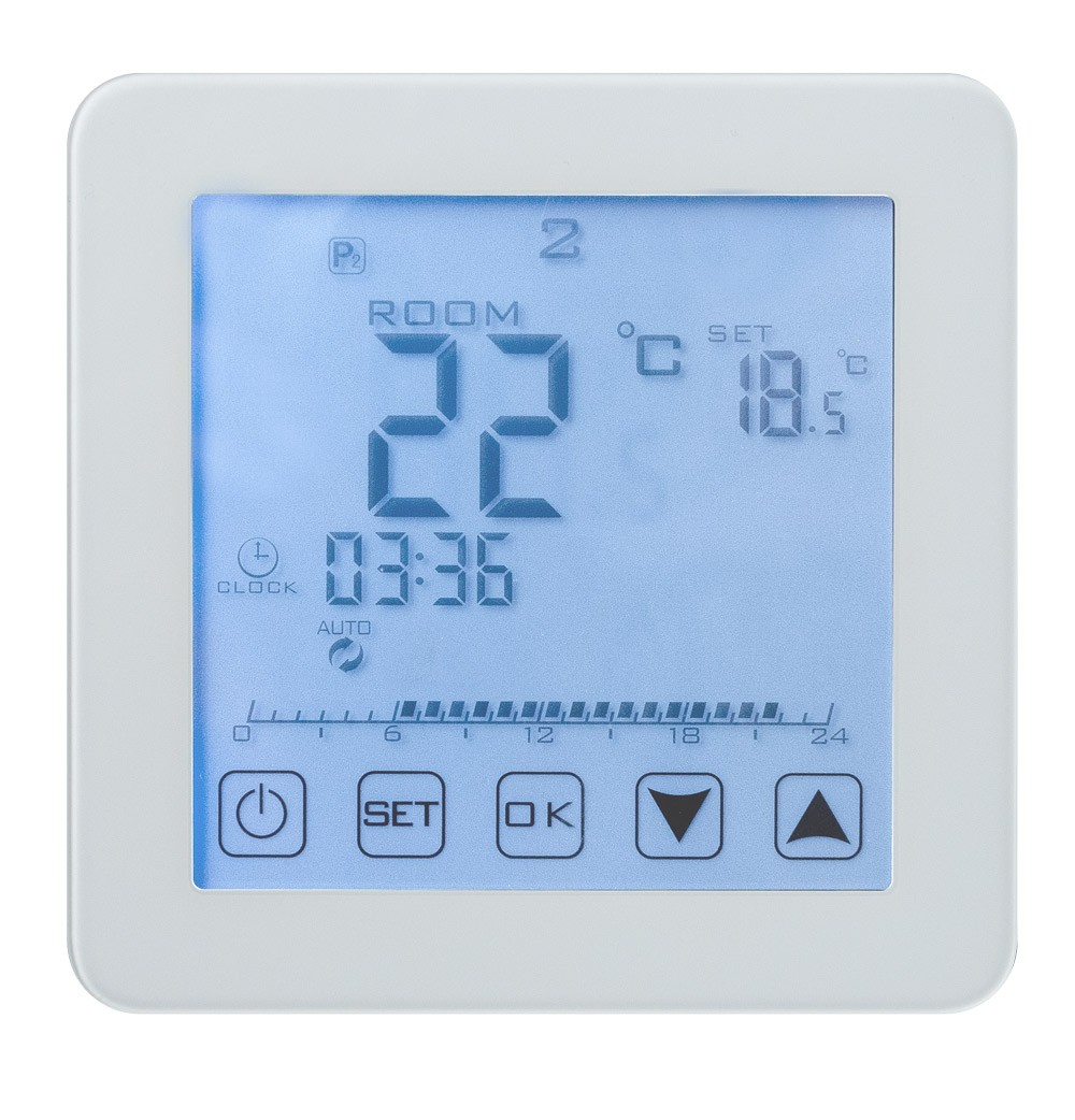 Grindiniam šildymui valdyti skirtas programuojamas elektroninis termostatas. Komplekte yra grindinis temperatūros jutiklis su 3 m ilgio signalo perdavimo kabeliu. Termostatas taip pat turi integruotą oro temperatūros jutiklį - galima naudoti ir kaip patalpos šildymo termostatą. Pilnai jutiklinis ekranas. Yra funkcija patalpų apsaugai nuo užšalimo. Vartotojo instrukcija prisegta žemiau esančiame faile.