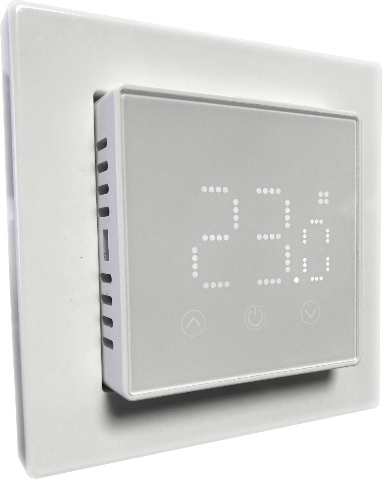 Grindiniam šildymui valdyti skirtas programuojamas elektroninis termostatas. Komplekte yra grindinis temperatūros jutiklis su 3 m ilgio signalo perdavimo kabeliu. Termostatas taip pat turi integruotą oro temperatūros jutiklį - galima naudoti ir kaip patalpos šildymo termostatą. Priekinė dalis - balto stiklo, pilnai jutiklinis ekranas. Yra funkcija patalpų apsaugai nuo užšalimo.