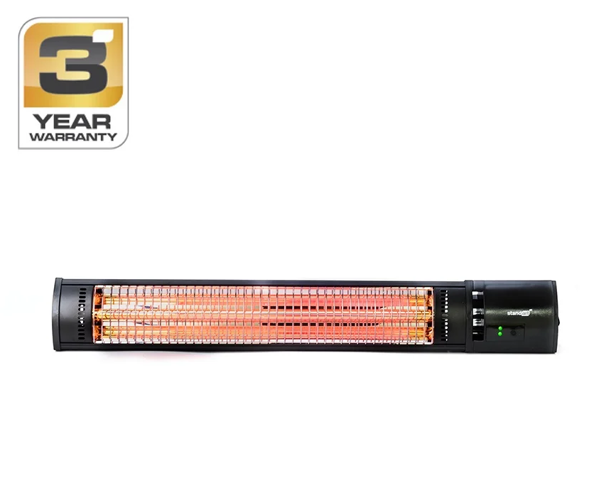 Tvirtinamas prie sienos (tvirtinimo kronšteinas įeina į komplektaciją), komplekte su maitinimo kabeliu. 2 galingumo lygiai (1250W/2500W). Pridedamas nuotolinio valdymo pultelis įjungimui/išjungimui, veikimo galingumo nustatymui. Nedegina oro ir dulkių. Pilnai hermetiškas - tinkamas naudoti lauko sąlygomis.