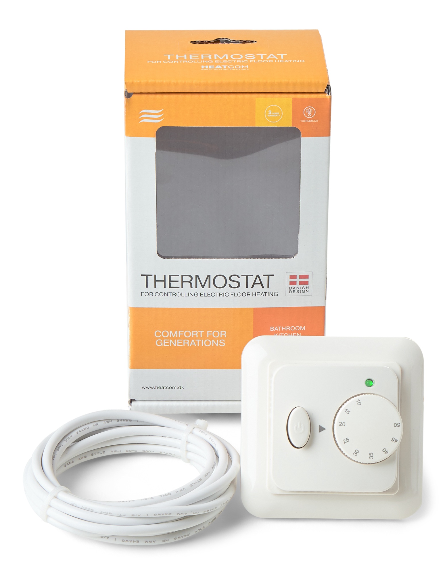 Grindiniam šildymui valdyti skirtas mechaninis termostatas. Komplekte yra grindinis temperatūros jutiklis su 3 m ilgio signalo perdavimo kabeliu.